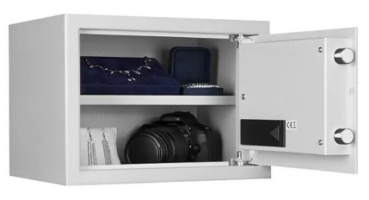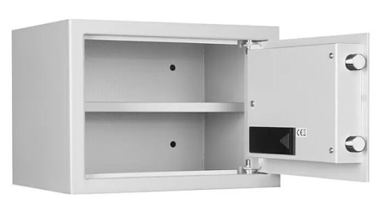 Serienmäßig mit Elektronikschloss mit mechanischer Notöffnung, 2 Notöffnungsschlüssel, akustische und optische Funktionsüberwachung, 3 bis 8-stelliger Benutzercode, inkl. Batterien